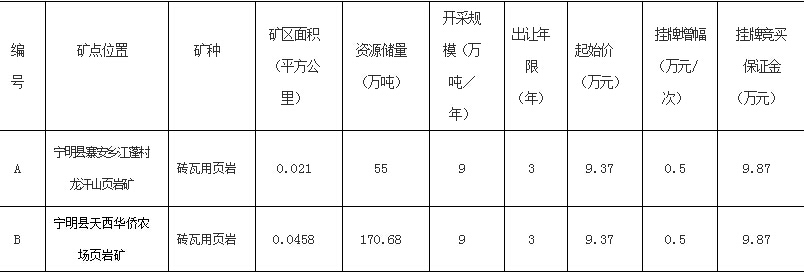 根據(jù)《中華人民共和國(guó)礦產(chǎn)資源法》、《探礦權(quán)采礦權(quán)招標(biāo)拍賣(mài)掛牌管理辦法(試行)》、《寧明縣礦產(chǎn)資源總體規(guī)劃》和《寧明縣人民政府關(guān)于同意寧明縣2015年度采礦權(quán)出讓計(jì)劃的批復(fù)》(寧政函〔2015〕34號(hào))精神,我局委托崇左市公共資源交易中心以公開(kāi)掛牌方式出讓下列兩宗采礦權(quán)。現(xiàn)將有關(guān)掛牌出讓事項(xiàng)公告如下: