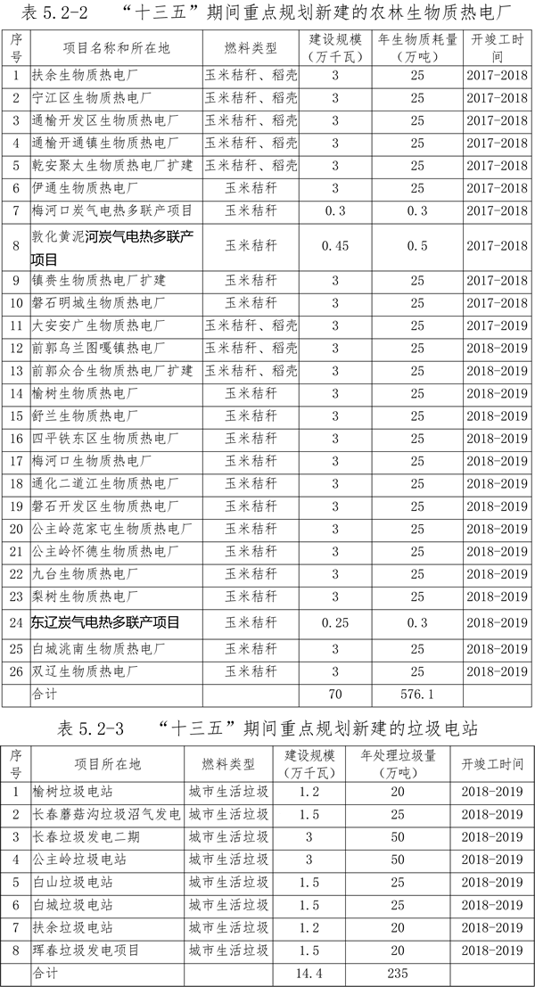 1)推進(jìn)生物質(zhì)發(fā)電項目建設(shè)。根據(jù)生物質(zhì)資源分布情況和農(nóng)林生物質(zhì)電廠、城市生活垃圾電站建成情況,在“十三五”期間重點(diǎn)規(guī)劃新建扶余等26座農(nóng)林生物質(zhì)電廠和通化、榆樹等8座垃圾電站。具體項目見表5.2-2和表5.2-3。