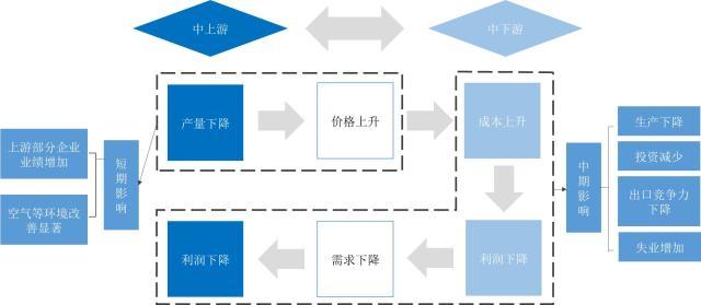 資本市場,一個廣為流傳的所謂邏輯是環(huán)保限產(chǎn)短期內(nèi)會對部分周期性產(chǎn)品價格產(chǎn)生支撐作用,但中期環(huán)保限產(chǎn)帶來的供給下滑會對經(jīng)濟基本面產(chǎn)生負面影響。在這一所謂邏輯下,“2+26”城市采暖期限產(chǎn)、環(huán)保督察嚴格落實,部分產(chǎn)品供給將出現(xiàn)顯著下滑(電解鋁、粗鋼、水泥等限產(chǎn)規(guī)模占比將超過8.4%、11.1%和16.3%),短期內(nèi)相應產(chǎn)品的價格會出現(xiàn)明顯上升。中期來看,上游直接關(guān)停,中下游因原材料成本上升導致利潤縮窄,下游需求下降抵消價格上漲,繼而引發(fā)生產(chǎn)放緩、投資下滑。同時,環(huán)保容忍度提升降低出口競爭力,帶來失業(yè)和消費能力的降低。長期來看,環(huán)保限產(chǎn)不能增加環(huán)保設備、缺乏市場化手段來內(nèi)生環(huán)境成本,以至于高效產(chǎn)能面臨關(guān)停的窘境,最終對產(chǎn)業(yè)升級難起作用。