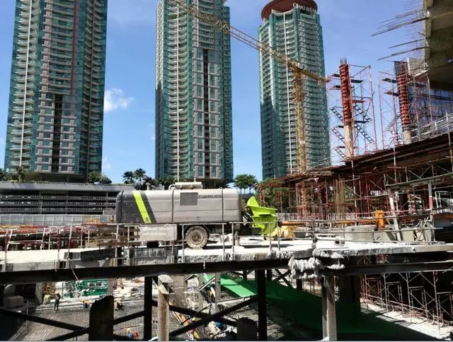 ▲中聯(lián)重科塔機(jī)與拖泵在泰國施工