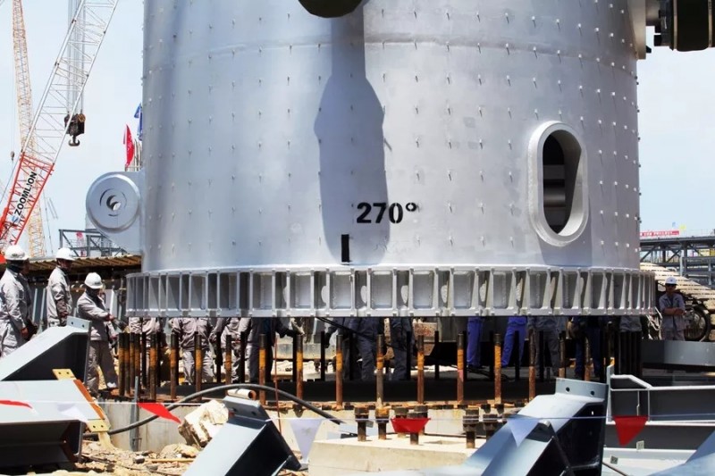 ▲即將被吊的龐然大物:凈重達1308噸的石化反應器