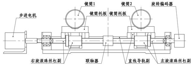 為了增加雙鏡筒測(cè)頭的測(cè)量范圍,實(shí)現(xiàn)測(cè)量范圍的自動(dòng)調(diào)節(jié),我們?cè)陔p鏡筒測(cè)頭基礎(chǔ)上又增加了一套間距自動(dòng)調(diào)整裝置。該裝置主要由鏡筒托板、直線導(dǎo)軌、精密滾珠絲杠、步進(jìn)電機(jī)和旋轉(zhuǎn)編碼器組成。