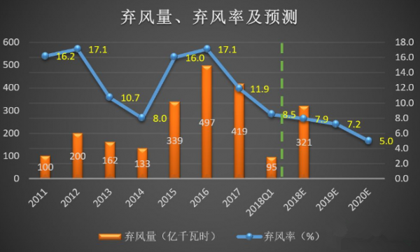 通過分析棄風率,從上圖可知,從2011年至2016年,棄風率呈先下降后上升趨勢,到2016年棄風率達到了最高值17.1%,與2012年持平,此后棄風率不斷下降,2017年為11.9%,環(huán)比下降30.41%,2018年一季度為8.7%,預計到2018年年底將降至7.9%,2019年將會達到7.2%,2020年降至5%。