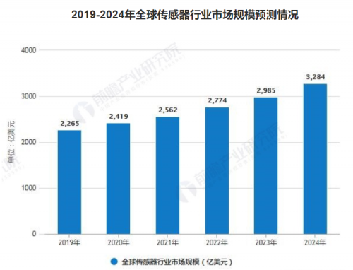 據(jù)前瞻產(chǎn)業(yè)研究院統(tǒng)計數(shù)據(jù)顯示,2018 年全球傳感器行業(yè)市場規(guī)模已突破 2000 億美元,未來 5 年全球傳感器市場將保持 8%左右的速度增長,到 2024 年市場規(guī)模將會達到 3284 億美元。