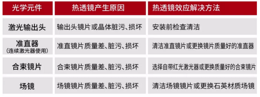 由于光學(xué)元件質(zhì)量差、臟污、損壞等原因造成對(duì)激光吸收率增大,光學(xué)元件受激光束連續(xù)較長(zhǎng)時(shí)間照射后,溫度升高產(chǎn)生熱變形,進(jìn)而引起透過(guò)型光學(xué)元件的折射率和反射型光學(xué)元件的反射方向發(fā)生變化。熱透鏡效應(yīng)會(huì)改變激光焦點(diǎn)(束腰)的位置,進(jìn)而影響應(yīng)用效果。