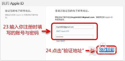 第十三步.進入蘋果注冊賬號驗證頁面,輸入注冊時填寫的賬號與密碼,然后點擊“驗證地址”