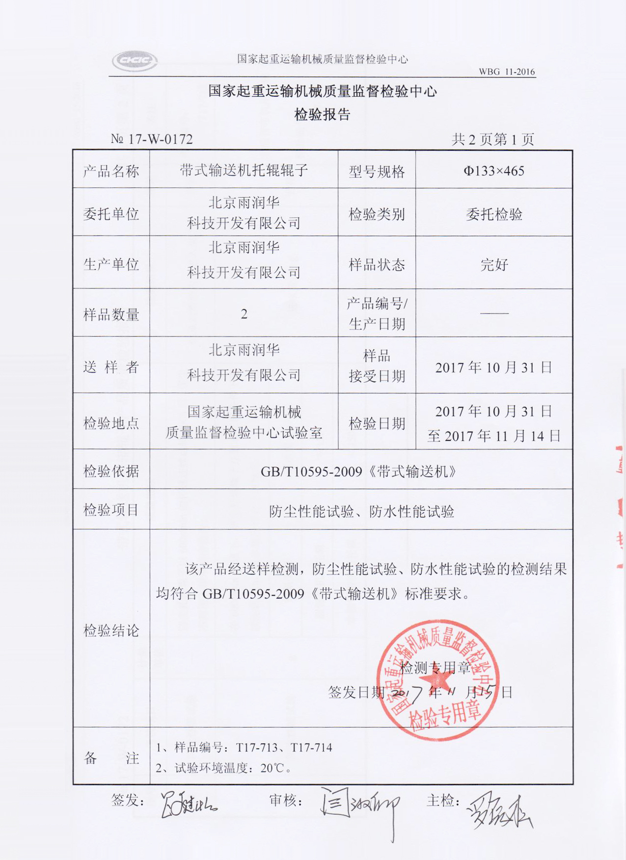 北京雨潤華公司雨潤華托輥檢測報告