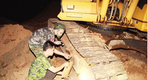 接近15日零時,埋伏在樹林中的執(zhí)法人員發(fā)現(xiàn)舉報點開始出現(xiàn)亮光,并傳來大型機械的轟鳴聲?!暗V老鼠”開始干活了。“再忍耐一下,沉住氣,準(zhǔn)備好各自的器材裝備,準(zhǔn)備突擊?!睅ш爤?zhí)法人員通過對講機發(fā)出指令,所有執(zhí)法人員各裝整備,屏住呼吸等待突擊指令的發(fā)出。