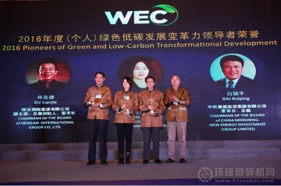 2017年1月12日,由國際生態(tài)經(jīng)濟(jì)協(xié)會主辦,世界環(huán)保大會組委會組織承辦的“2016綠色低碳發(fā)展變革力領(lǐng)導(dǎo)者年會”在京召開;國家有關(guān)部委領(lǐng)導(dǎo)、國務(wù)院參事、中國工程院院士、清華大學(xué)、北京大學(xué)等專家學(xué)者和來自21個國家駐華使館官員和聯(lián)合國人居署、世界銀行等國際組織的高級官員,近百名國內(nèi)外企業(yè)家共同出席會議;在本屆年會上共有3位個人和22家單位獲得第六屆國際碳金獎的各類別殊榮。