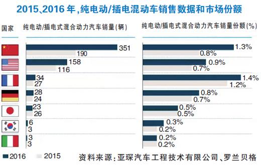 在市場規(guī)模層面,整體而言,2016年,僅有法國與中國兩個國家的純電動和插電式混合動力汽車市場份額超過1%。