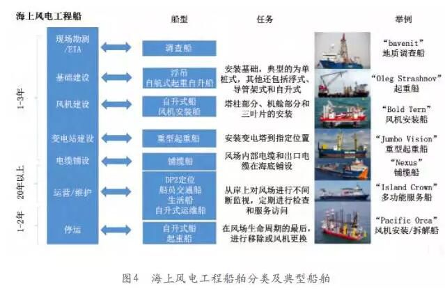 隨著項目的增加和技術(shù)難度的提升,海上風電工程裝備需求大增,具體包括:起重船/平臺、風機運輸船、風電安裝船/平臺、風電運維船、鋪纜船、供應船、調(diào)查船等一系列工程船。其中,起重船、風機運輸船、鋪纜船、調(diào)查船等與其他海工船的功能并無明顯差別,在對原有工程船進行適當改裝后可實現(xiàn)通用。