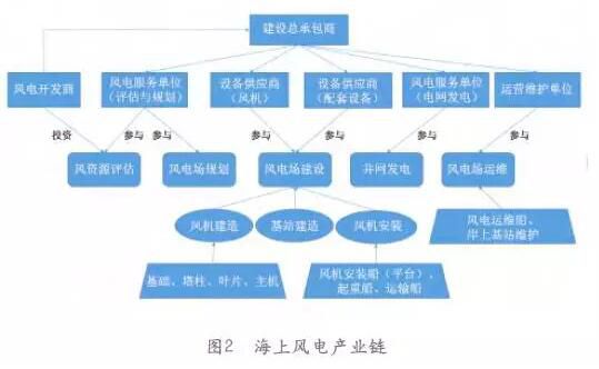 海上風能利用的不斷增加也必將帶動產(chǎn)業(yè)鏈內(nèi)的各相關(guān)行業(yè)發(fā)展。海上風電產(chǎn)業(yè)的運行,以海上風電投資企業(yè)為主導和驅(qū)動力,其總投資量在很大程度上決定了風電項目的規(guī)模和相關(guān)企業(yè)的獲利大小;以海上風電設(shè)備制造業(yè)為硬件供應,廣義上的風電設(shè)備供應應當包括風機整機供應和相關(guān)海上風電工程裝備供應??傮w來說,海上風電產(chǎn)業(yè)鏈的運行主線為:風資源評估―風電場規(guī)劃―風電場建設(shè)―并網(wǎng)發(fā)電―風電場運維。