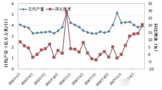 圖4 我國(guó)天然氣生產(chǎn)情況(2015年1月至2017年6月)