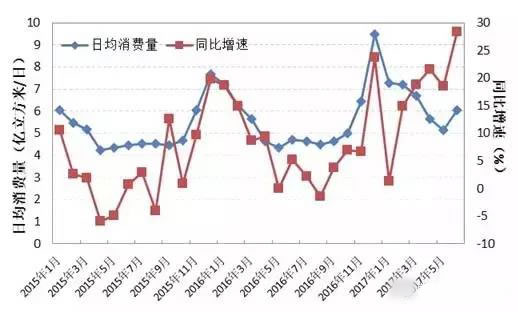 圖3 我國(guó)天然氣消費(fèi)量(2015年1月至2017年6月)
