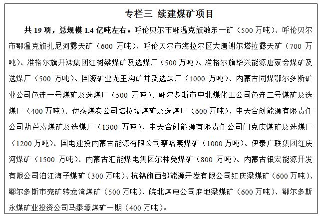 穩(wěn)步推進煤炭生產基地建設。統(tǒng)籌安排煤炭總量和布局,依托勝利、五間房、白音華、準格爾、東勝、上海廟、伊敏、寶日希勒等大型整裝煤田,按照國家總體能源戰(zhàn)略部署,重點圍繞保障煤電、現(xiàn)代煤化工等主要耗煤項目用煤需求,推動鄂爾多斯、錫林郭勒、呼倫貝爾三大煤炭生產基地建設,力爭到2020年原煤產量控制在11.5億噸左右?!笆濉逼陂g,建成投產煤礦項目35項,總規(guī)模2.5億噸左右。續(xù)建煤礦項目19項,總規(guī)模1.4億噸左右,其中鄂爾多斯1.2億噸、呼倫貝爾2000萬噸左右。圍繞煤電和煤化工基地配套用煤項目,擬新開工并建成煤礦項目16項,總規(guī)模1.2億噸左右,其中鄂爾多斯新增產能6500萬噸、錫林郭勒新增產能4500萬噸、通遼新增產能600萬噸左右。