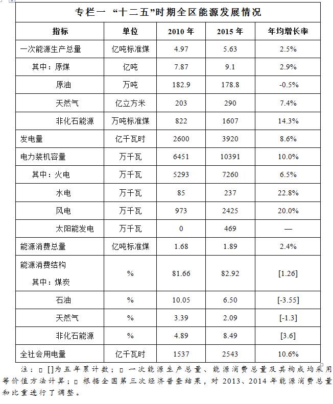 能源結構不斷優(yōu)化?!笆濉逼陂g,全區(qū)能源結構由傳統(tǒng)化石能源為主逐步向化石能源和非化石能源并重轉變,能源發(fā)展呈現(xiàn)出多元化、低碳化的特征。天然氣和非化石能源在一次能源生產總量中的比重分別提高至2015年的6.9%和2.9%,較2010年分別提高1.5個和1.2個百分點;煤炭在一次能源生產總量中的比重降低至2015年的90%以下,較2010年下降2.6個百分點;非化石能源裝機比重由2010年的16.4%提高至30.1%;非化石能源消費比重提高至8.5%,“十二五”期間累計提高3.6個百分點。