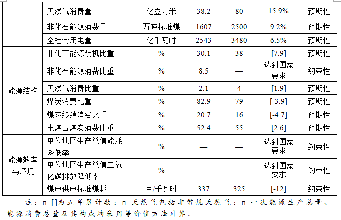 ――能源結構。進一步提高非化石能源裝機和消費比重,非化石能源裝機比重達到38%左右,非化石能源消費比重達到國家要求。天然氣消費比重提高到4%左右,煤炭消費比重降低到79%左右。煤炭終端消費比重下降到16%左右,電煤占煤炭消費比重提高到55%左右。