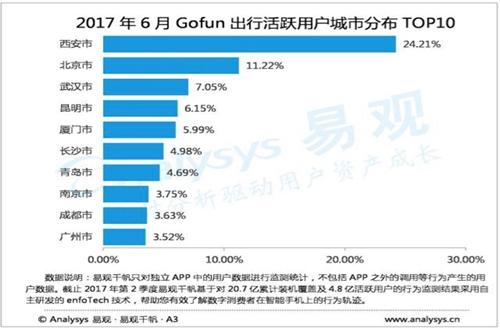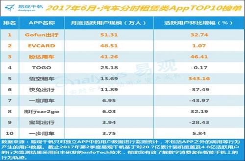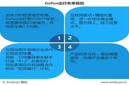 2017年8月8日,交通運(yùn)輸部、住房城鄉(xiāng)建設(shè)部聯(lián)合發(fā)布《關(guān)于促進(jìn)小微型客車租賃健康發(fā)展的指導(dǎo)意見》,鼓勵(lì)汽車分時(shí)租賃市場(chǎng)發(fā)展。 在資本助力及政策支持下,在消費(fèi)升級(jí)的大背景下,未來,汽車分時(shí)租賃市場(chǎng)用戶規(guī)模將會(huì)保持穩(wěn)健增長(zhǎng)態(tài)勢(shì)。 2017年6月,在汽車分時(shí)租賃TOP10榜單中,Gofun出行以51.31萬人的月活用戶規(guī)模位居榜首,EVCARD、盼達(dá)用車分別以48.51萬人、41.26萬人的月活用戶規(guī)模位列榜單第二、第三位。 Gofun出行是首汽集團(tuán)旗下首汽智行科技有限公司打造的新能源汽車分時(shí)租賃項(xiàng)目,背靠首旅集團(tuán)及首汽集團(tuán),在資本、場(chǎng)地、運(yùn)營(yíng)、品牌、充電設(shè)施等方面具先天優(yōu)勢(shì)。截止2017年7月底,Gofun出行共投入新能源汽車約1.2萬輛,覆蓋中國(guó)21個(gè)城市。