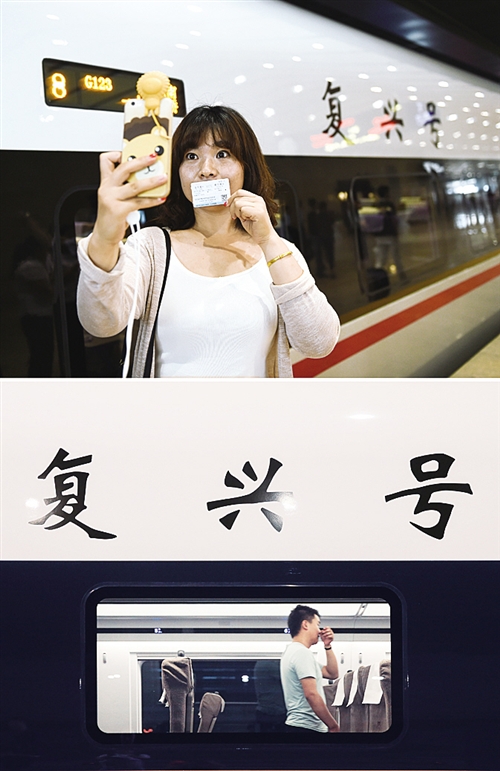 上圖:一位乘坐“復(fù)興號(hào)”G123次列車的乘客在北京南站車外與列車合影。新華社記者 鞠煥宗攝