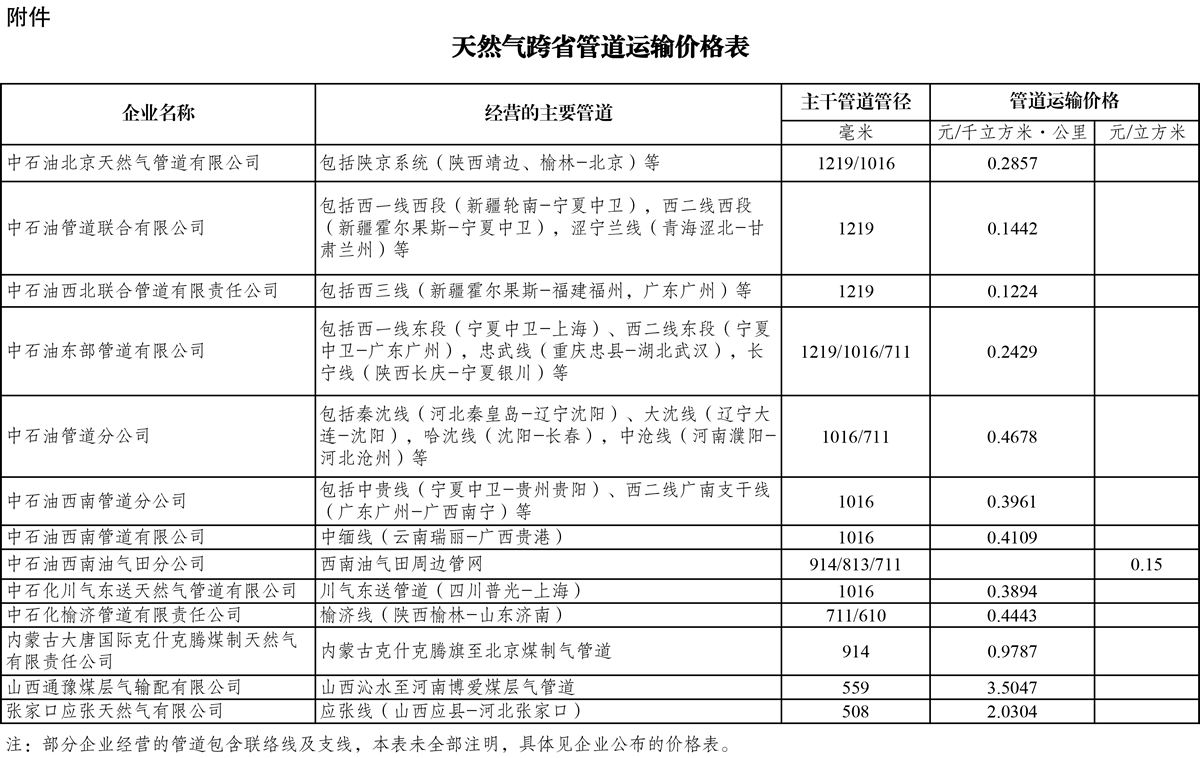 附件:天然氣跨省管道運(yùn)輸價(jià)格表