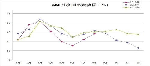 中國農(nóng)業(yè)機(jī)械流通協(xié)會發(fā)布的2017年8月份中國農(nóng)機(jī)市場景氣指數(shù)(AMI)為42.4%,環(huán)比上升9.1個百分點,同比下降5.4個百分點。從環(huán)比看,6個一級指數(shù)除了農(nóng)機(jī)補(bǔ)貼以外全部呈現(xiàn)上升趨勢,其中人氣指數(shù)增幅最高,上升19.0個百分點。從同比看,6個一級指數(shù)全部下降,其中農(nóng)機(jī)補(bǔ)貼指數(shù)的降幅最大,降幅達(dá)26.8個百分點,其它5個一級指數(shù)與上年相比下降幅度不大。目前,6個一級指數(shù)中效益指數(shù)和農(nóng)機(jī)補(bǔ)貼指數(shù)位于景氣區(qū)間。