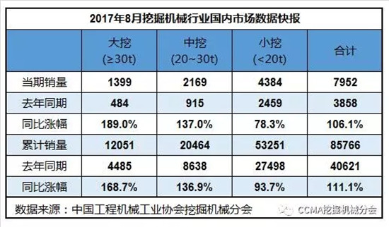根據(jù)中國工程機械工業(yè)協(xié)會挖掘機械分會行業(yè)統(tǒng)計數(shù)據(jù),2017年1―8月納入統(tǒng)計的25家主機制造企業(yè),共計銷售各類挖掘機械產(chǎn)品91439臺,同比漲幅101.1%。國內(nèi)市場銷量(不含港澳臺)85766臺,同比漲幅111.1%。出口銷量5641臺,同比漲幅17.8%。