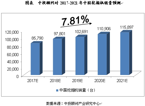 挖掘機是工程機械行業(yè)的先行品種,景氣度通常領(lǐng)先其他工程機械品種3-6個月不等。2016年,我國挖掘機累計銷量為70,320臺,同比增長了24.8%,為4年來首次實現(xiàn)正增長。我們預計,2017年中國挖掘機銷量將達到85,790臺,未來五年(2017-2021)年均復合增長率約為7.81%,2021年中國挖掘機銷量將達到115,897臺。