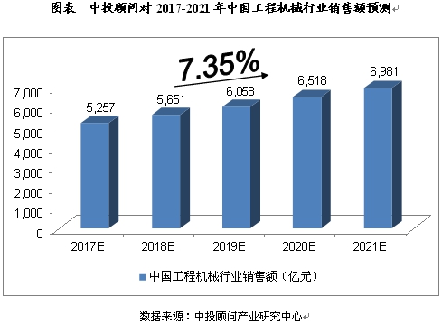 綜合以上因素,我們預計,2017年中國工程機械行業(yè)銷售額將達到5,257億元,未來五年(2017-2021)年均復合增長率約為7.35%,2021年中國工程機械行業(yè)銷售額將達到6,981億元。