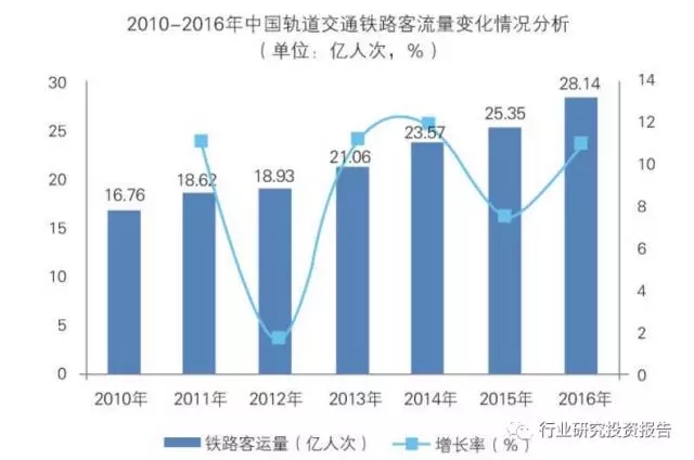 從近五年我國鐵路旅客發(fā)送量可以看出,整體上呈逐年上升趨勢,2016年的旅客發(fā)送量達(dá)到28.14億人次,同比增長11.01%。