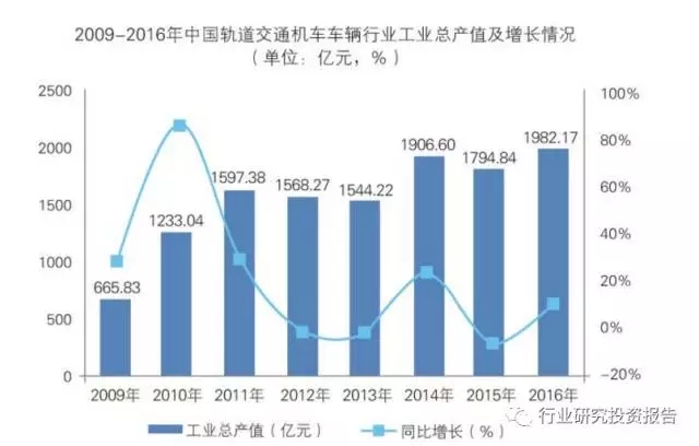 2009-2016年,中國(guó)軌道交通機(jī)車車輛行業(yè)工業(yè)總產(chǎn)值呈波動(dòng)變化趨勢(shì),其中,2010年行業(yè)工業(yè)總產(chǎn)值為1058.24億元,同比增長(zhǎng)58.93%,為近年來(lái)最大增幅。2015年,行業(yè)工業(yè)總產(chǎn)值為1794.84億元,同比下降5.86%。2016年,行業(yè)工業(yè)總產(chǎn)值為1982.17億元,同比增長(zhǎng)10.44%。