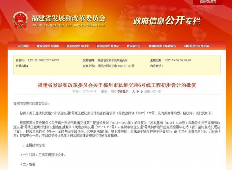 10日,福建省發(fā)改委網(wǎng)站發(fā)布《福建省發(fā)展和改革委員會關于福州市軌道交通6號線工程初步設計的批復》,其中指出:福州市軌道交通6號線初步設計起點站會展中心站(含)至終點站機場站(含),線路全長約40.869km。全線共設車站19座,其中高架站1座,地下站18座!