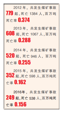 5年來,全國煤礦事故死亡人數(shù)由2012年1383人下降到2016年的538人,煤炭百萬噸死亡率由2012年的0.374下降到2016年的0.156。