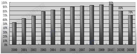 2000-2030年全球并網(wǎng)系統(tǒng)占總安裝量比例及預測(單位:%)