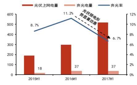 2015H1-2017H1 全國光伏棄光限電情況(億千瓦時(shí))