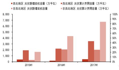 至 2017 年上半年,西北地區(qū)光伏累計(jì)裝機(jī) 3458.9 萬千瓦,非西北地區(qū)累計(jì)裝機(jī) 6723.1 萬千瓦.2015-2017 年上半年間,非西北地區(qū)光伏累計(jì)裝機(jī)全國占比從 46%持續(xù)增長至 66%,相應(yīng)地西北地區(qū)光伏累計(jì)裝機(jī)占比下降 20 個(gè)百分比降至 66%,光伏建設(shè)中心逐漸從西北轉(zhuǎn)移至中東部地區(qū)。