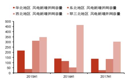 2015H1-2017H1各地區(qū)風(fēng)電新增并網(wǎng)容量 (萬千瓦)