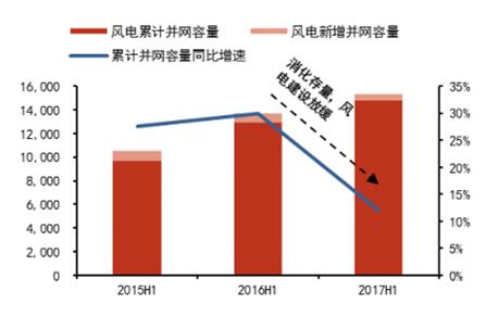 2017年上半年,為改善棄風(fēng)棄光問題,消化現(xiàn)有存量,增量風(fēng)電建設(shè)逐步放緩。全國風(fēng)電新增并網(wǎng)容量601萬千瓦,相較15、16 年上半年新增容量有所下滑,但仍然繼續(xù)保持穩(wěn)步增長勢頭,累計(jì)并網(wǎng)容量達(dá)到 1.54 億千瓦,同比增長 12%。