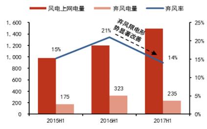 2015H1-2017H1全國風(fēng)電棄風(fēng)限電情況 (億千瓦時(shí))