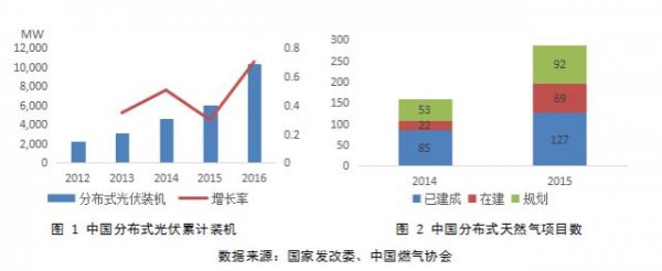 從中國的視角來看,隨著中國經(jīng)濟(jì)發(fā)展進(jìn)入“新常態(tài)”,中國能源行業(yè)發(fā)展的根本目標(biāo)已是天壤之別。過去,中國經(jīng)濟(jì)持續(xù)的高速增長導(dǎo)致能源供應(yīng)短缺,那時(shí)的時(shí)代主線是擴(kuò)大能源生產(chǎn)以保障供應(yīng);如今,經(jīng)濟(jì)發(fā)展放緩,能源供給能力已遠(yuǎn)超需求,反而是技術(shù)、環(huán)境、價(jià)格、效率等問題制約了進(jìn)一步發(fā)展,中國能源發(fā)展的問題從數(shù)量問題逐漸轉(zhuǎn)為質(zhì)量問題。短短五年間,中國見證了可再生能源在裝機(jī)容量方面的爆發(fā)式增長。然而,嚴(yán)重的“棄風(fēng)棄光”問題成為了限制可再生能源進(jìn)一步發(fā)展的瓶頸。分布式能源的特征符合中國下一階段能源發(fā)展“提質(zhì)增效”的目標(biāo),因此分布式能源在中國也顯現(xiàn)了迅猛崛起的勢頭。分布式光伏累計(jì)裝機(jī)從2012年時(shí)的2.3GW快速上升至2016年底的10.3GW(如圖),年均增長率高達(dá)46%;分布式天然氣項(xiàng)目數(shù)(包括建成、在建、規(guī)劃)從2014年時(shí)的160個(gè)增長至2015年底時(shí)的288個(gè)。