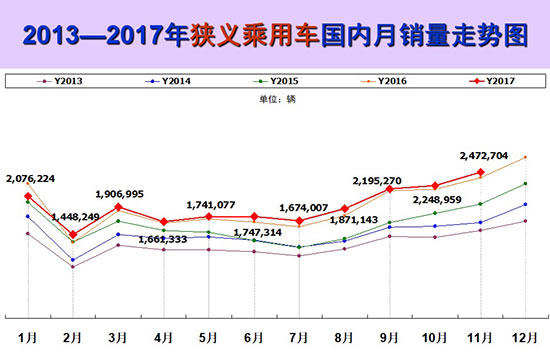 12月8日,全國(guó)乘用車市場(chǎng)信息聯(lián)席會(huì)(以下簡(jiǎn)稱“乘聯(lián)會(huì)”)發(fā)布數(shù)據(jù)顯示:2017年11月我國(guó)狹義乘用車銷量為2472704輛,同比增長(zhǎng)3.9%,環(huán)比漲幅為9.9%;綜合前11個(gè)月數(shù)據(jù),1-11月我國(guó)狹義乘用車?yán)塾?jì)銷量突破2千萬(wàn)輛,達(dá)到21027530輛,同比增長(zhǎng)2.3%。