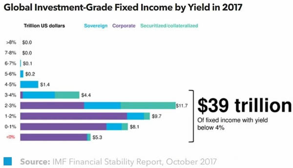 2007年,全球有3.4萬億美元的投資級(jí)固定收益產(chǎn)品收益率低于4%,而到了2017年,這一數(shù)字則達(dá)到了39萬億美元。