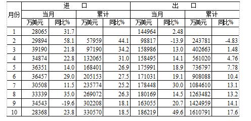 2017年10月進(jìn)口額2.84億美元,同比增長(zhǎng)23.8%;出口額18.62億美元,同比增長(zhǎng)49.6%。