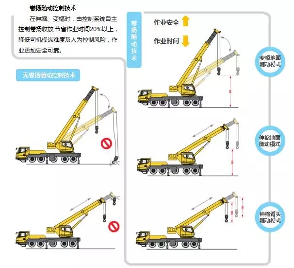 “顧此失彼,摔過吊鉤的有沒有你?”“吊鉤升過了頭的,你也經(jīng)歷過吧?”你可能覺得這沒什么大問題,但這其中不僅浪費了時間、損壞了設(shè)備,更致命的是產(chǎn)生巨大的安全隱患。而XCT80L6的卷揚隨動技術(shù),可以在伸縮、變幅過程中,利用控制系統(tǒng)自主控制卷揚收放,節(jié)省作業(yè)時間20%以上,這不僅降低了操作難度,而且有效控制風(fēng)險,使作業(yè)更加安全可靠。