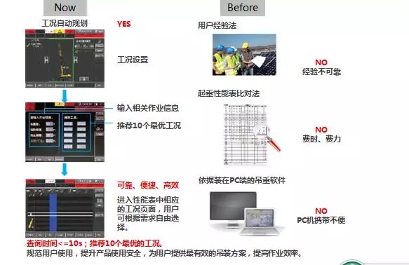 XCT80L6,只需要向顯示器輸入吊重量、作業(yè)起止幅度和高度信息,系統(tǒng)會自動推薦能夠滿足吊裝要求的最簡便的工況。并且可以隨時隨地查詢工況并進行相應(yīng)設(shè)置,避免了額外攜帶相關(guān)材料及設(shè)備,同時簡化工況設(shè)置過程,減少操作失誤率。