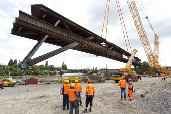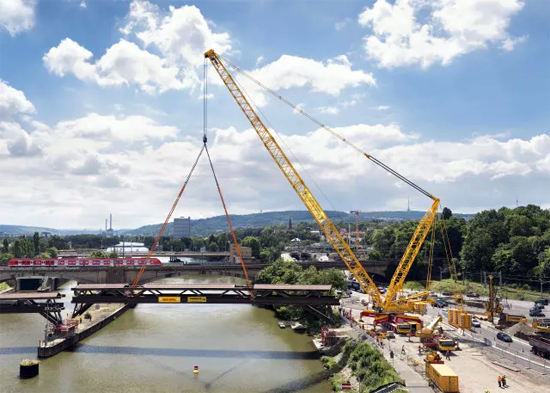 作為斯圖加特21基礎(chǔ)設(shè)施項目的一部分,必須拆除一座人行天橋,以便在巴登-符騰堡州首府新建一座鐵路橋。起重機承包商Wiesbauer將其利勃海爾LG 1750桁架臂起重機組裝在內(nèi)卡河河岸上用以移除木橋。盡管橋梁重量明顯高于預(yù)期,但利勃海爾起重機成功完成了這項工作。