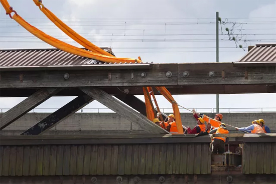 項目規(guī)劃人員在抽取材料樣本并審核設(shè)計文件后,預(yù)計該橋總重量為110噸。然而,當(dāng)屋頂木橋被吊起來的時候很快就清楚了,它比計算的重得多。直到LG 1750的起重機機艙顯示總重142噸的情況下,橋腳才從橋墩和河墩駛離,剩下的就很容易了。木結(jié)構(gòu)慢慢地在內(nèi)卡河上方擺動,并放在岸邊進(jìn)行最后的拆除。重量差異是由于安裝了大量的角撐板和鐵增強件。