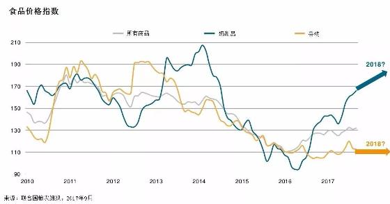2016年進入低谷后,2017年奶制品價格出現(xiàn)大幅攀升;糧食價格則維持平穩(wěn)