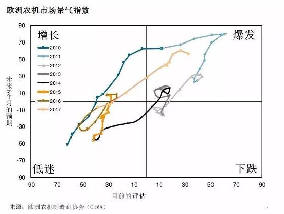 進入2017年以來,歐洲農(nóng)機市場景氣指數(shù)開始回升,預計將逼近2011年的最高紀錄。而這一周期的上漲,德國機械制造商協(xié)會將其歸因于奶制品以及飼草作物的價格上漲。