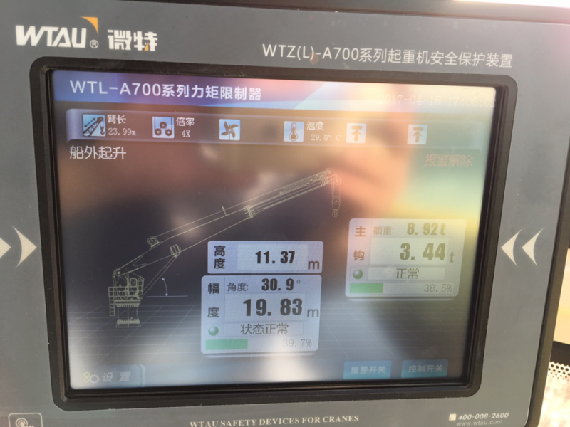 上圖為微特電子配備的WTL-A700型力矩限制器顯示儀,該型號(hào)儀表采用8寸TFT LCD觸摸屏,SG高耐蝕性熱鍍層鋼板機(jī)身,鋁合金面板;IP65防水性,最大800x600(V)像素;可動(dòng)態(tài)仿真的顯示當(dāng)前重量、幅度、角度、額重、工況等參數(shù)。并可外接PLC,智能儀表,板卡,模塊,變頻器等工業(yè)自動(dòng)化設(shè)備。顯示儀自帶8M內(nèi)存,并可擴(kuò)展外部記錄SD卡。