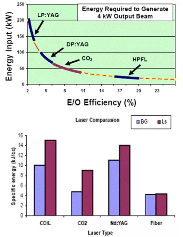 圖各類光纖激光器在能量需求上和進(jìn)行巖石去除所需能量的對比(HPFL:高功率光纖激光器)